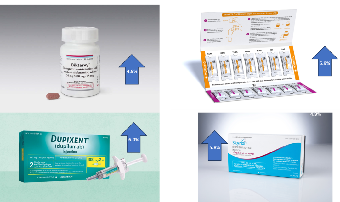 Gilead将 其HIV 药物Biktarvy(bictegravir)的标价提高了 4.9%,达到 3980 美元左右。他们同样认为这个价格不会对患者造成影响。艾伯维将其牛皮癣药物 Skyrizi (risankizumab-rzaa)的标价提高了 5.8%。他们拒绝就价格上涨发表评论,目前一剂的Skyrizi售价为 21017 美元。