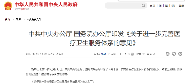 2023年3月23日,中共中央办公厅、国务院办公厅印发《关于进一步完善医疗卫生服务体系的意见》,并发出通知,要求各地区各部门结合实际认真贯彻落实。