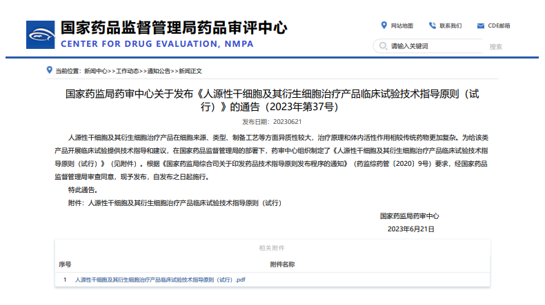 2023年6月21日,国家药品监督管理局药审中心组织制定了《人源性干细胞及其衍生细胞治疗产品临床试验技术指导原则(试行)》。