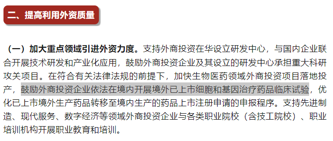 2023年8月13日,国务院印发《关于进一步优化外商投资环境 加大吸引外商投资力度的意见》,其中提出:在符合有关法律法规的前提下,加快生物医药领域外商投资项目落地投产,鼓励外商投资企业依法在境内开展境外已上市细胞和基因治疗药品临床试验。
