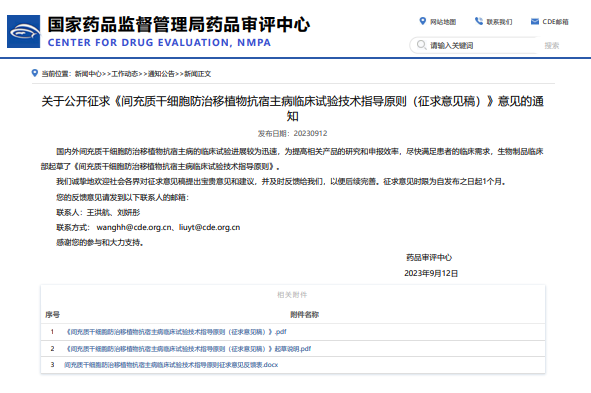 国内外间充质干细胞防治移植物抗宿主病的临床试验进展较为迅速,为提高相关产品的研究和申报效率,尽快满足患者的临床需求,国家药品监督管理局药品审评中心生物制品临床部起草了《间充质干细胞防治移植物抗宿主病临床试验技术指导原则(征求意见稿)》。