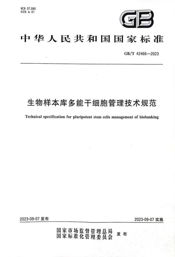 9月23日第四届中国干细胞与再生医学协同创新平台大会公布了中国首个人源干细胞国家标准——《生物样本库多能干细胞管理技术规范》(标准编号:GB/T 42466-2023)