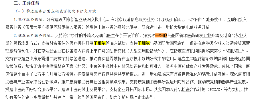 明确提出,探索对干细胞与基因领域医药研发企业外籍及港澳台从业人员的股权激励方式。支持符合条件的医疗机构开展干细胞等临床试验。支持干细胞与基因研发国际合作。促进在京港澳企业人类遗传资源管理服务便利化。