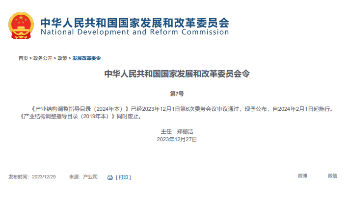 2023年12月29日,国家发展改革委对外发布《产业结构调整指导目录(2024年本)》,自2024年2月1日起正式施行。