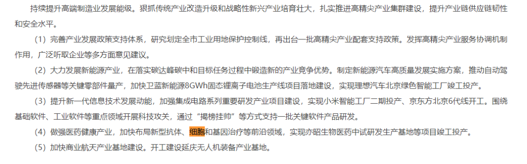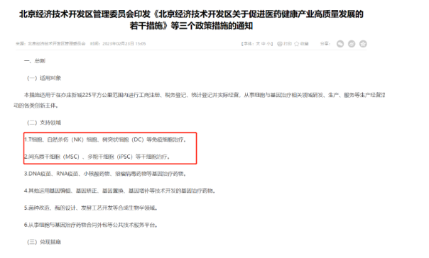 2023年2月23日北京经济技术开发区印发3份文件,分别是:《北京经济技术开发区关于促进医药健康产业高质量发展的若干措施》、《北京经济技术开发区关于促进高端医疗装备智造产业高质量发展的若干措施》、《北京经济技术开发区关于促进细胞与基因治疗产业高质量发展的若干措施》,以促进细胞与基因治疗等产业高质量发展。