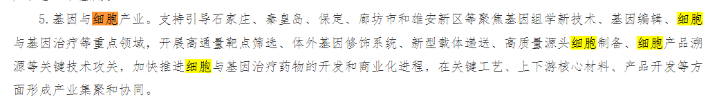 在基因与细胞产业,支持引导石家庄、秦皇岛、保定、廊坊市和雄安新区等聚焦基因组学新技术、基因编辑、细胞与基因治疗等重点领域,开展高通量靶点筛选、体外基因修饰系统、新型载体递送、高质量源头细胞制备、细胞产品溯源等关键技术攻关,加快推进细胞与基因治疗药物的开发和商业化进程,在关键工艺、上下游核心材料、产品开发等方面形成产业集聚和协同。