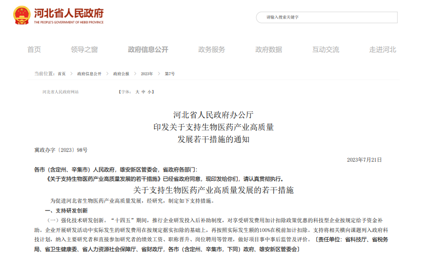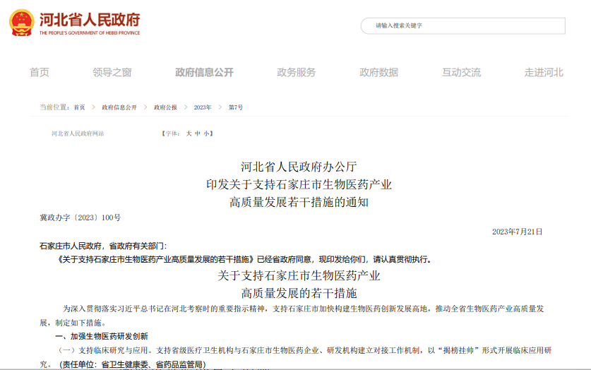 2023年7月21日河北省人民政府办公厅印发 《关于支持生物医药产业高质量发展的若干措施》,提出支持研发创新、 壮大市场主体、 促进产业化发展、 强化要素保障、优化政务服务。
