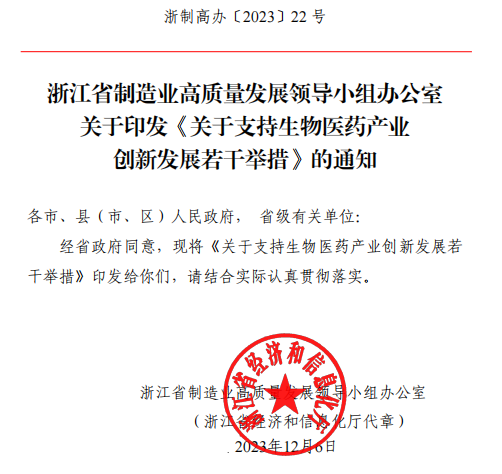 2023年12月12日浙江省制造业高质量发展领导小组办公室印发《关于支持生物医药产业创新发展若干举措》。在聚力关键核心技术攻关、推动临床研究和成果转化、推动创新产品临床使用和应用推广、打造世界级先进制造业集群、创新审评审批机制、推动未来产业发展等方向制定了具体方案。
