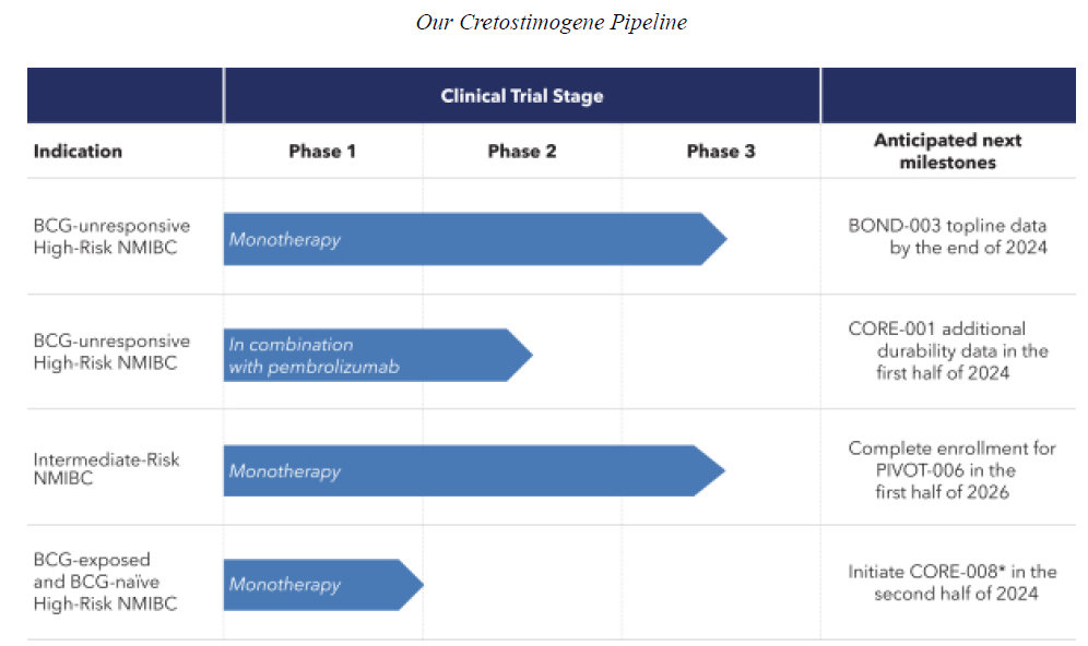 该项试验还在继续进行,预计将于2024年底报告顶线数据。如果成功,CG Oncology将以该试验结果为基础向FDA提交Cretostimogene的生物制品许可申请(BLA)。