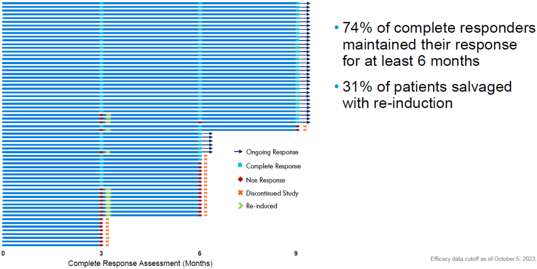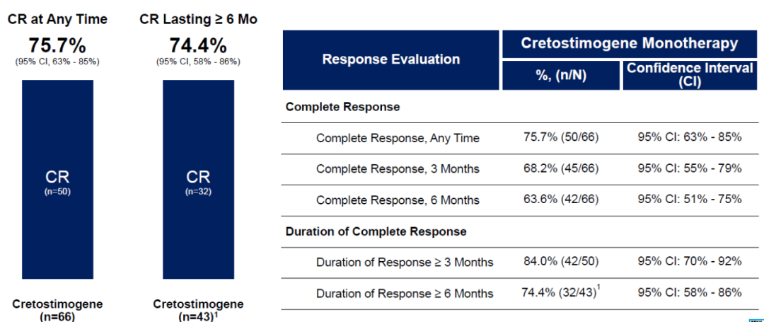 BOND-003是一项评估Cretostimogene单药治疗BCG无反应的高危NMIBC的试验。2023年11月份,CG Oncology公布了BOND-003试验的中期数据:截至2023年10月5日,66名患者中有50名患者达到完全缓解(CR),完全缓解率为75.7%,维持6个月以上完全缓解率为74.4%(图3)[3]。