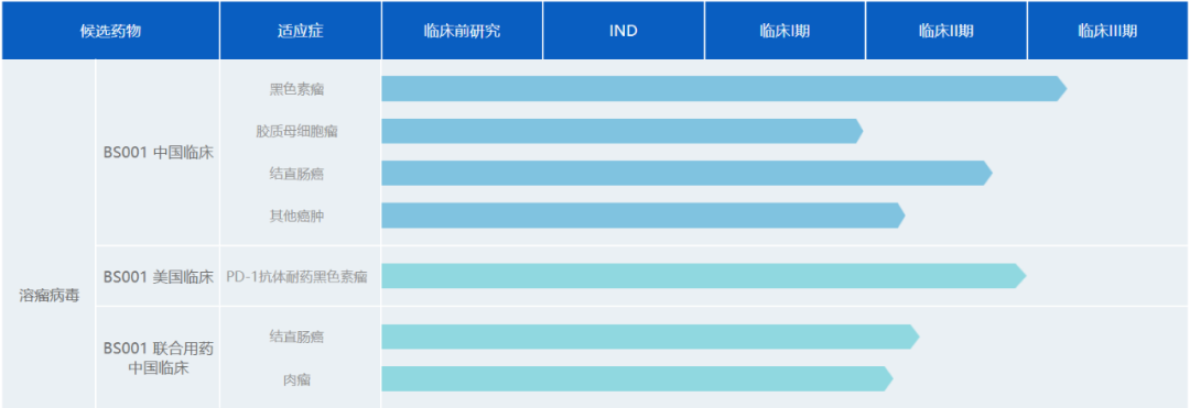 BS001是由滨会生物自主研发的全球第一个选择Ⅱ型单纯疱疹病毒(HSV2)作为载体,并进入临床试验的溶瘤病毒候选药物,其用于治疗黑色素瘤的试验已进入临床3期,与此同时滨会生物在中美同时开展BS001的临床试验(图7)。