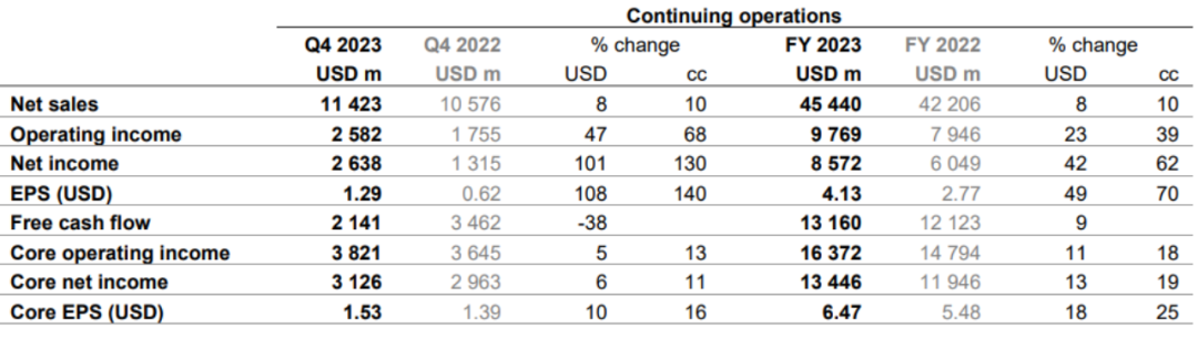 1月31日,诺华发布2023年报,2023年全球净销售额为454.4亿美元,同比增长10%。销售额增长主要得益于Entresto(+31%cc)、Kesimpta(+99% cc)、Kisqali (+75% cc)、Pluvicto (+261% cc) 和 Scemblix (+179% cc)的的持续强劲表现。第4季度净销售额达到114.23亿美元,增长10%,核心营业收入增长13%。