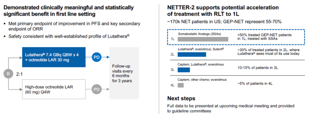 2023年9月25日,诺华宣布Lutathera组的III期NETTER-2试验达到了主要终点。与单独使用高剂量长效奥曲肽相比,Lutathera 联合长效奥曲肽一线治疗可显著改善新诊断的SSTR阳性、2 级和3级晚期胃肠胰神经内分泌肿瘤 (GEP-NET)患者的PFS(图6)[10]。