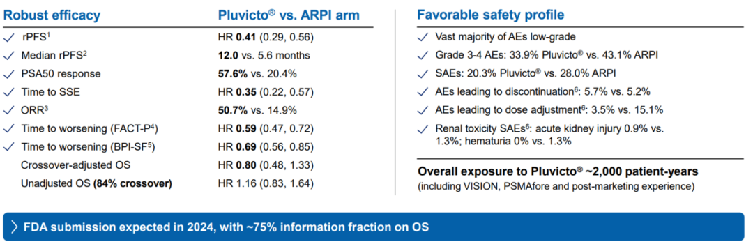 2023年欧洲肿瘤内科学会(ESMO)大会上,诺华公布了Pluvicto的III期PSMAfore试验的数据:与雄激素受体通路抑制剂(ARPI)治疗组相比,Pluvicto组达到了其主要终点,在前列腺特异性膜抗原(PSMA)阳性转移性去势抵抗性前列腺癌(mCRPC)患者中具有临床意义和统计学意义[13]。