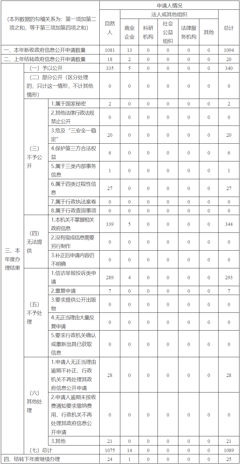 2023年,我委共收到政府信息公开申请1094件。其中,通过委官方网站提交申请表的946件,占比86.5%;通过信函提交申请的143件,占比13%;当面提交5件,占比0.5%。公民个人提出申请1081件,占比98.8%;法人或其他组织提出申请13件,占比1.2%。经查,2022年收到,结转至2023年作出答复的政府信息公开申请20件;2023年收到,结转至2024年作出答复的政府信息公开申请25件;综上,2023年度我委共办理政府信息公开申请1089件。