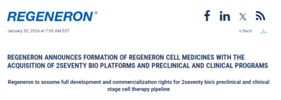 1月30日,再生元宣布收购2seventy bio,获得后者的药物发现平台和临床生产平台及其管线中的在研新型免疫细胞疗法的全部开发和商业化权益。并且再生元将成立新部门Regeneron Cell Medicines,以推进收购所得项目及自身细胞疗法项目的开发。该交易预计将在2024年上半年完成。
