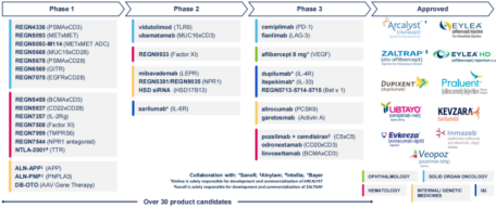 凭借强大的研发实力以及对外合作,再生元建立了丰富的产品管线,涵盖眼病、过敏和炎症性疾病、癌症、心血管和代谢疾病、血液系统疾病、传染病和罕见病等,据不完全统计,其目前有大约35种候选产品处于临床开发阶段。