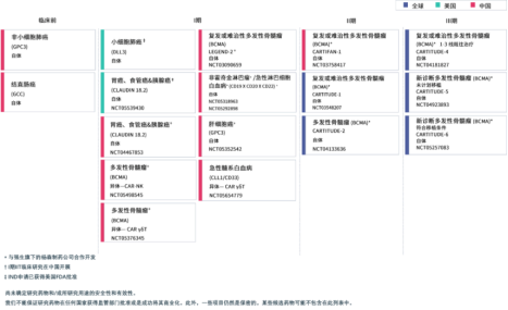 聚焦国内市场,在细胞治疗领域绕不开西达基奥仑赛也绕不开传奇生物。传奇生物是金斯瑞旗下公司,专注于自体和异体嵌合抗原受体T细胞疗法。目前有17项在研产品,主要针对恶性血液肿瘤和实体瘤。作为肿瘤免疫细胞治疗领域的佼佼者,自FDA批准Kymriah以来,传奇生物引领着细胞疗法的研究和商业化进程。通用型CAR-T和CAR-NK技术虽然处于起步阶段,但具有巨大潜力和前景。在国内,传奇生物展现了强大的实力和差异化布局,覆盖了多种适应症。