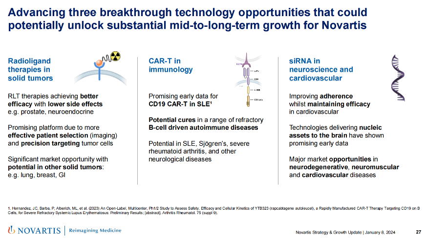 在今年刚结束的JPM大会上,诺华向我们展示了未来要重点推进的三个突破性的技术,分别是:siRNA、RDC(放射性核素偶联药物)以及CAR-T为代表的CGT(细胞基因疗法),这些技术可能为诺华带来可观的中长期增长。