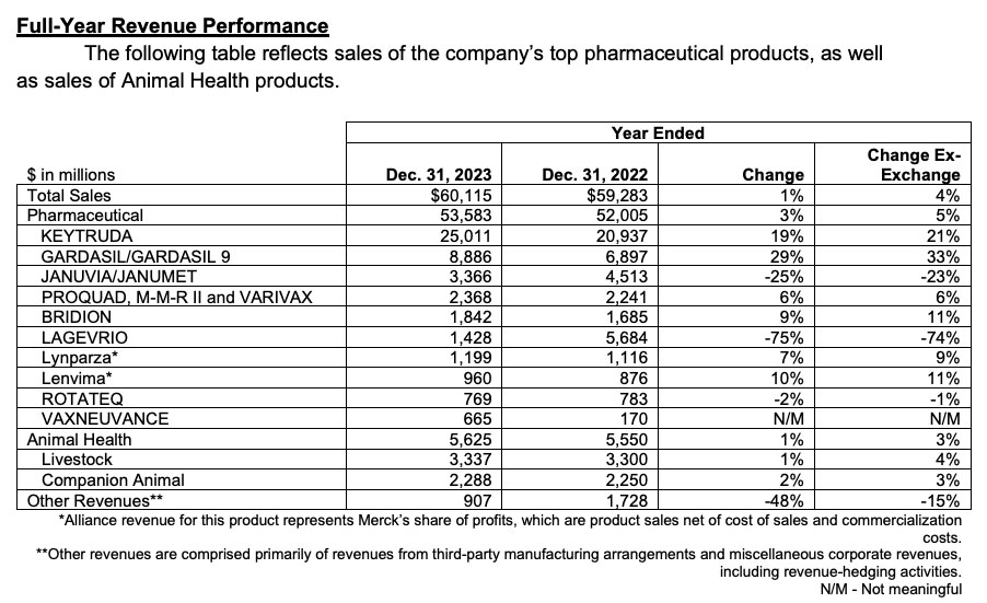 2 月 1 日,默沙东公布了 2023 年 Q4 及全年业绩,2023 年全球实现 601.15 亿美元营收,同比增长 1 %;若排除新冠口服药 Molnupiravir(LAGEVRIO),则增长 9 % 。