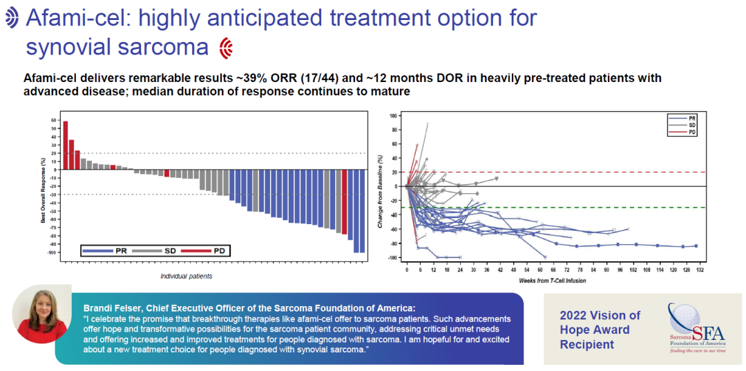 Afami-cel的SPEARHEAD-1关键临床试验已达到主要疗效终点。~39%接受Afami-cel的患者有临床反应,中位反应持续时间~12个月(CTOS 2022)。