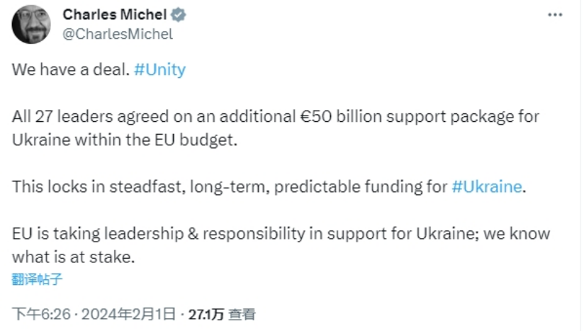 欧洲理事会主席米歇尔当天在社交媒体上表示:“所有27位领导人都同意在欧盟预算内为乌克兰提供500亿欧元的额外支持。”他说:“这为乌克兰锁定了稳定、长期、可预测的资金。”