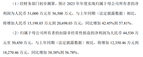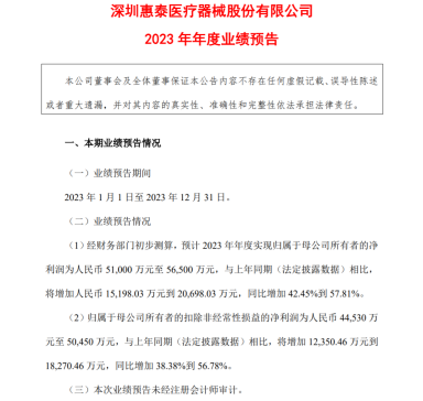在控制权变更前夕,1月24日晚间,惠泰医疗才发布了2023年年度业绩预告,其预计2023年实现归母净利润5.1亿元至5.65亿元,与上年同期数据相比,同比预计增长42.45%到57.81%。