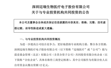 背后出现的创投机构——晨壹投资和珠海彤昇,正是迈瑞医疗的战略落子。2023年5月12日,迈瑞医疗发布公告称,拟与晨壹基金管理(北京)有限公司(含其全资子公司)共同投资有限合伙企业,其中公司拟作为有限合伙人以自有资金认缴出资额12亿元。