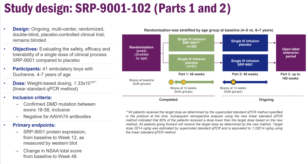 ELEVIDYS的加速批准上市基于其临床试验SRP-9001-102的结果。SRP-9001-102是一项1:1随机,双盲,交叉对照试验,受试者均为4~7岁DMD男性患者。试验结果显示,受试者骨骼肌中 ELEVIDYS 微肌营养不良蛋白表达的增加。在结合临床需求和实际试验数据后,ELEVIDYS最终被批准用于 治疗4 ~5 岁杜氏肌营养不良症 (DMD)儿童患者。
