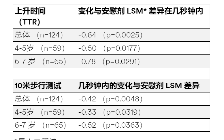 尽管如此,Sarepta认为这项试验仍然可以证明了ELEVIDYS在所有年龄组中具有相似的临床获益,因为试验中其所有次要终点(包括上升时间(p=0.0025)和10米步行测试(p=0.0048)均取得了积极且具有统计学意义的结果。