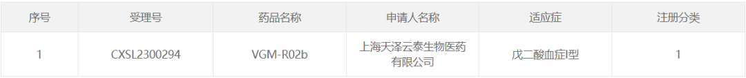阶段:2023年4月28日,上海天泽云泰公司申报的VGM-R02b临床试验申请(IND)获CDE受理。7月13日,VGM-R02b获得国家药品监督管理局批准同意开展治疗戊二酸血症I型的临床试验。