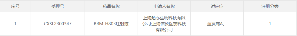 阶段:2023年7月24日,信念医药公司(Belief BioMed,BBM)全资子公司上海信致医药科技有限公司和上海勉亦生物科技有限公司申报的“BBM-H803注射液”临床试验申请获临床试验默示许可,适应症为血友病A。