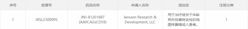 阶段:2023年8月2日,强生(Johnson & Johnson)旗下杨森(Janssen)申报的1类新药JNJ-81201887(AAVCAGsCD59)获CDE临床试验默示许可,拟开发用于治疗继发于年龄相关性黄斑变性的地图样萎缩成人患者。