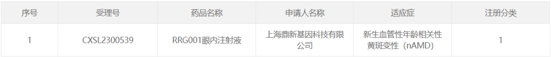 阶段:2023年8月12日,上海鼎新基因RRG001眼内注射液临床试验申请(IND)获CDE受理。11月6日,RRG001眼内注射液的临床试验申请(IND)已获国家药品监督管理局(NMPA)默示许可批准。
