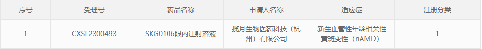阶段:2023年10月19日,九天生物(Skyline Therapeutics)宣布旗下揽月生物医药科技有限公司自主研发的AAV眼科基因治疗药物SKG0106眼内注射溶液的临床试验申请(IND)获CDE批准,开展治疗新生血管性年龄相关性黄斑变性(nAMD)的新药临床试验。