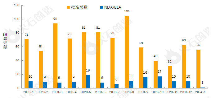 图1 2023年1月—2024年1月FDA药物批准数量变化情况 来源:火石创造产业数据中心