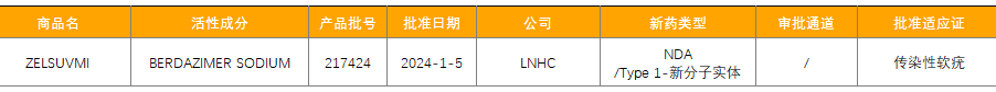 本月FDA批准的唯一一款NDA/BLA药物为first-in-class产品Zelsuvmi外用凝胶,用于治疗成人和1岁及以上儿童传染性软疣,其为全球治疗软疣感染的首个新型药物,也是治疗这种具高度传染性的病毒性皮肤感染的首个局部使用处方药。表1 2024年1月FDA批准NDA/BLA药物
