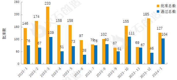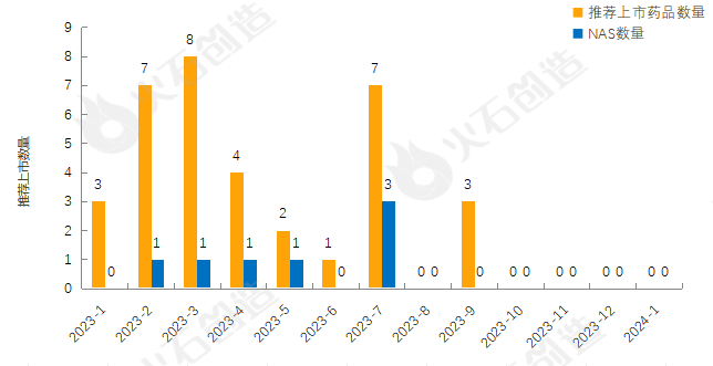 图2 2023年1月—2024年1月EMA推荐上市药品数量变化情况 来源:火石创造产业数据中心