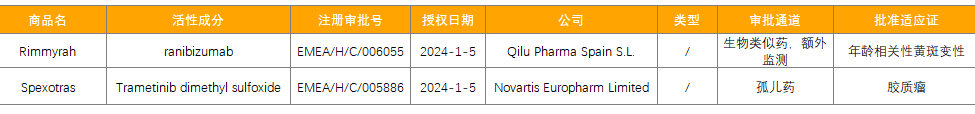 截至2024年2月5日,EMA在1月新授权2款药品上市,其中包含0款新活性物质,见表2。其中Rimmyrah(雷珠单抗注射液)是齐鲁制药研发的一款重组抗VEGF(血管内皮生长因子)人源化单克隆抗体,此次欧盟EMA获批上市使其成为首个“出海”的国产眼科生物制剂。表2 2024年1月EMA授权药物