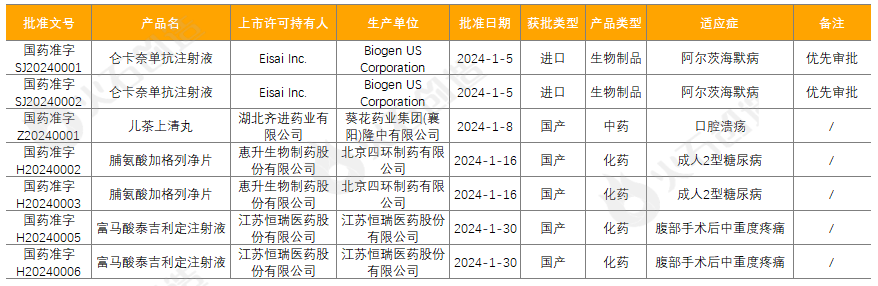Eisai Inc.申报的仑卡奈单抗注射液通过优先审评审批程序上市,用于治疗由阿尔茨海默病引起的轻度认知障碍和阿尔茨海默病轻度痴呆。仑卡奈单抗是近20年来美国FDA首个完全批准的阿尔茨海默症新药,2023年7月在美国获批上市,2023年9月在日本获得批准,中国是第三个批准该药上市的国家。该品种的上市为阿尔茨海默病患者提供了新的治疗选择。