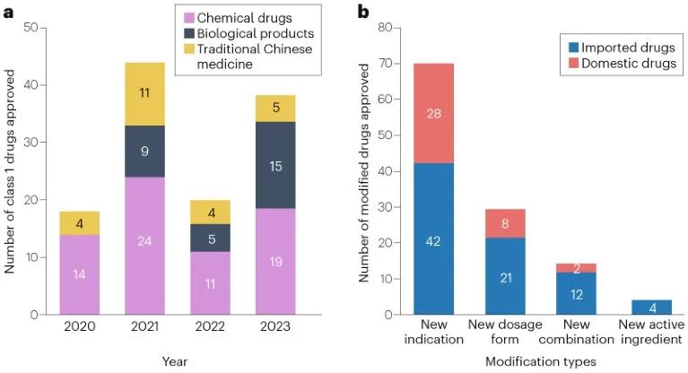 图2| NMPA批准的创新药和改良药的特点。A 2020年至2023年 NMPA 批准的1类药物数量。2020年至2022年的数据来自 NMPA 药品审评中心发布的药品审评年度报告。不包括疫苗和诊断试剂。B 2023年NMPA批准的改良药物类型。