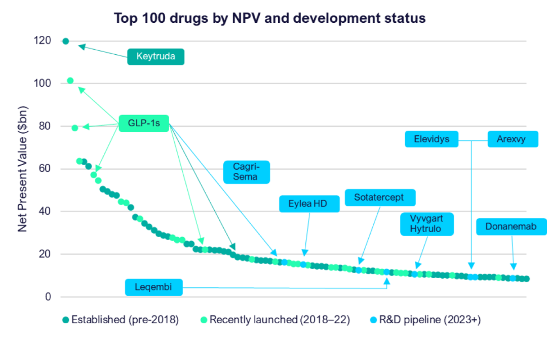 图1 Evaluate分析的100款主要药物净现值 图片来源:In Vivo