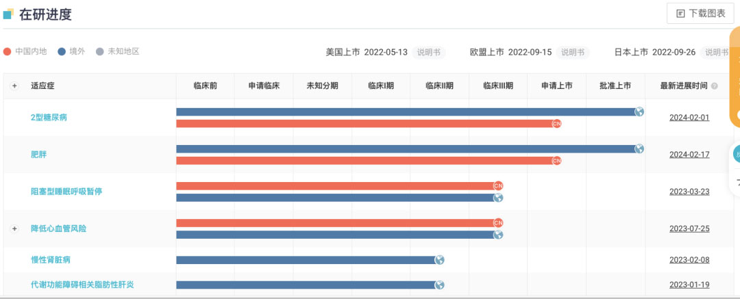 不仅如此,礼来还针对替尔泊肽布局了包括 NASH、慢性肾病、心血管风险等在内的多种适应症,将在新的疾病领域与诺和诺德继续比拼。替尔泊肽全球项目开发进度甘特图