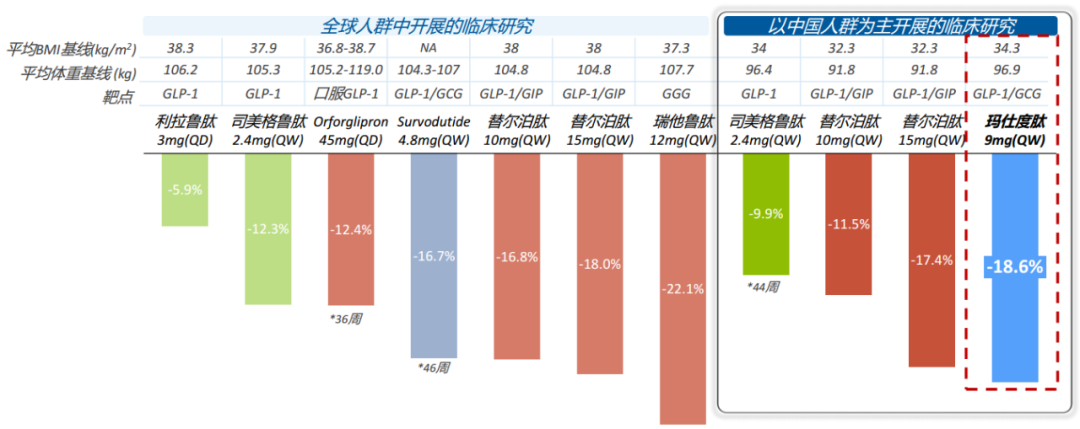 本月初,玛仕度肽的上市申请获 NMPA 受理,用于治疗肥胖症患者,预计将于 2024 年底或 2025 年初获批上市。II 期临床结果显示:玛仕度肽 9 mg 组 48 周减重 18.6%,疗效显著;而在中国超重或肥胖成人受试者中的首个 III 期临床研究(GLORY-1)此前也已达到主要终点。玛仕度肽 48 周较重效果对比