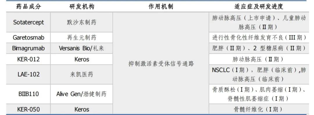 据 Insight 数据库,截至 2023 年 9 月底,处于临床开发阶段的激活素信号通路抑制剂候选药物有 7 种,开发适应症包括肺动脉高压、肥胖、骨纤维化、骨质疏松等。