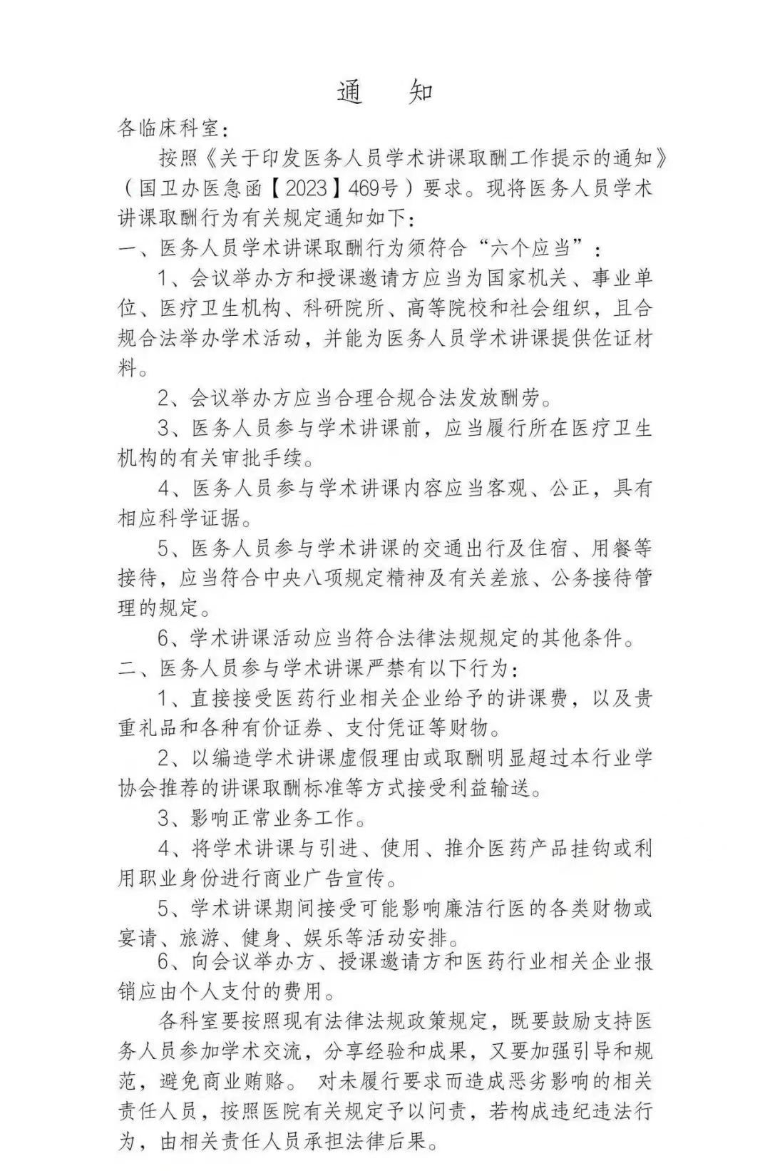 该通知显示,按照《关于印发医务人员学术讲课取酬工作提示的通知》(国卫办医急函2023】469号)要求,将对医务人员学术讲课取酬行为进行相应规范,必须符合包括会议举办方主体资格在内的“六个应当”,并严禁诸如直接接受医药企业讲课费等不合规行为。