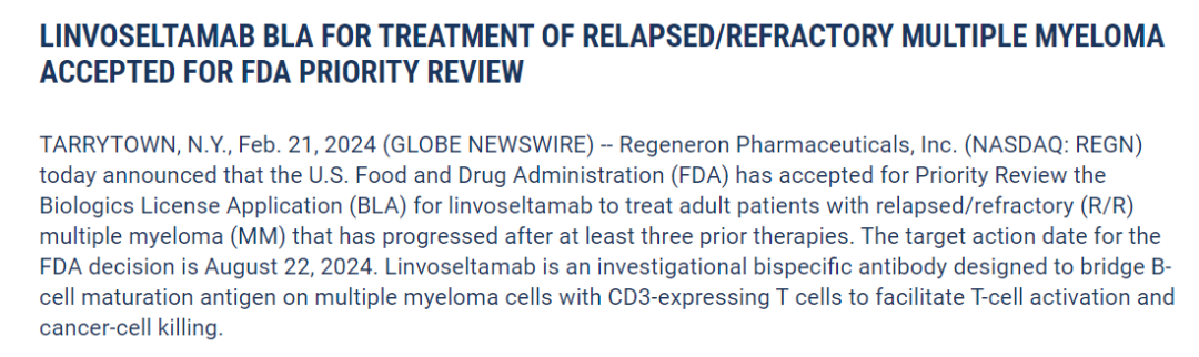 2月21日,再生元宣布,FDA已经同意优先审查linvoseltamab的生物制品许可申请(BLA),用于治疗既往至少接受过三次治疗的复发或难治性(R/R)多发性骨髓瘤(MM)患者。PDUFA日期为2024年8月22日。