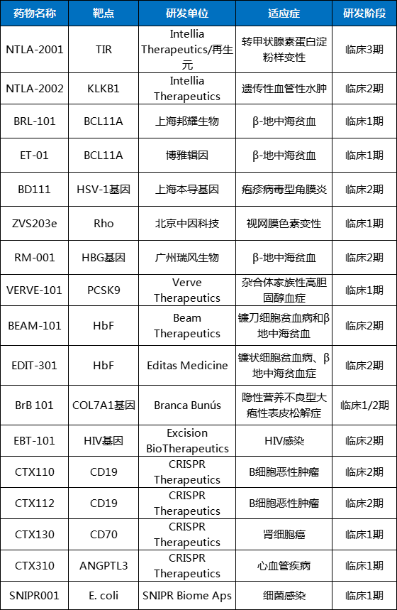 表1 全球在研基因编辑药物(部分)