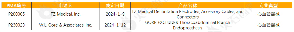 2024年1月有2个通过上市前批准(PMA)途径首次上市的产品。