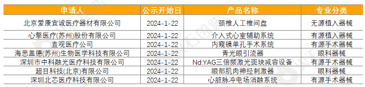 截至2024年2月5日,2024年1月国家局公示了7个三类医疗器械进入创新审批绿色通道,见表2。